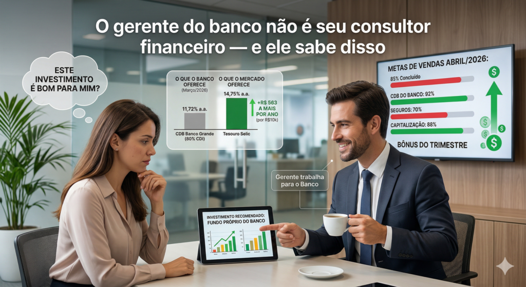 Você marca uma reunião com o gerente do banco. Ele sorri, oferece café e indica um investimento. Parece que está cuidando do seu dinheiro. Não está. Ele está cuidando da meta do banco. Por que o gerente de banco não trabalha para você Gerente de banco tem uma função central: atingir as metas financeiras da […]